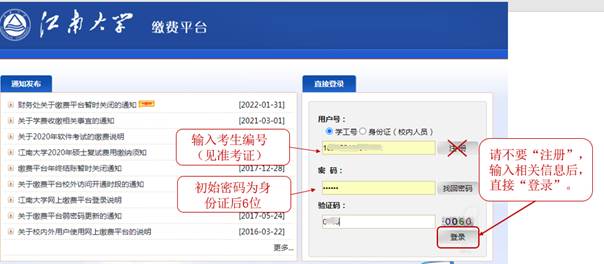 通过申请考核考生登录“江南大学网上缴费平台” (网址://pay.feifanent.com/payment/)。