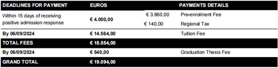 1.学费:根据两校协议,参与项目的同学需正常缴纳江南大学学费;在学习期间,需缴纳意大利新美术学院学费,2024学费(欧元)收费标准如下表: