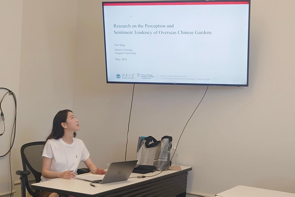 胡绮文、高祥、张译月和杨帆四位研究生分别介绍了各自的研究课题。胡绮文同学重点介绍了她对明代官迹图服饰的研究,高祥同学则分享了他对中国传统女性阶级冠饰的研究成果,张译月和杨帆则分别从史料分析与跨文化传播、中式景观园林的特点等方面阐述了她们的研究项目。