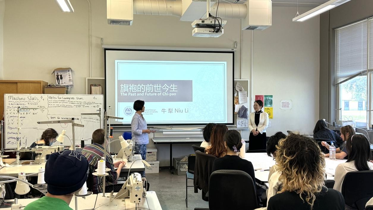 讲座在DES107,Cruess132教室举行,加州大学戴维斯分校服装与纺织系的师生参加了讲座。本次讲座旨在探讨旗袍在中国文化中的演变与发展,以及其在现代社会中的设计应用与意义。牛犁首先介绍了旗袍的历史文化渊源。她指出,旗袍起源于清朝末年至民国时期,是中国传统服饰的代表之一,具有悠久的历史传统。随后,她深入解读了旗袍的形制特点,包括其独特的剪裁设计和优雅的线条,突出了旗袍在传统文化中的独特地位。关于旗袍面料纹样的介绍。牛犁生动地描述了旗袍常用的丝绸、棉麻等材质,以及常见的传统纹样和刺绣工艺,展示了这些细节在旗袍设计中的重要性。随后,深入探讨了旗袍在现代社会中的设计运用和发展趋势,她强调了旗袍作为中国传统服饰的新型态和现代化转变,以及其在时尚领域中的独特地位和影响。讲座在与会同学们的积极互动交流中圆满结束。在提问环节,学生们就旗袍的设计、文化内涵和传承等方面向牛犁教授提出了许多深入的问题。牛犁耐心回答了每一个问题,还分享了她在服装设计领域的独特见解和经验。