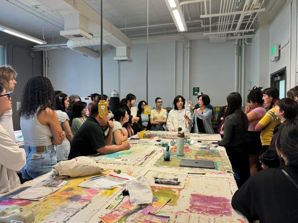 刺绣手工坊实践活动在DES160,Cruess108教室举办,由UCD设计收藏馆馆长Adele Zhang主持、牛犁教授协助、艺术设计专业研究生胡绮文同学示范完成,向UCD的学生们生动地介绍了苏绣的历史渊源和独特之处并向同学们展示了苏绣的传统基础针法,包括针线的选用、刺绣的起针和收针技巧,以及戗针、滚针、打籽等不同针法在创作中的运用方法。