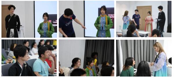 讲解过后,服艺2201班陈若嫣、张卓凡、翁领航换上改良版汉服,让大家近距离触摸面料之坚柔,体会图案之隽美。中华传统服饰之博大精深。朱本东详细介绍了不同衣物上的图案、工艺、风格,着重强调了襟襦裙是宋代女性的主要上衣,是一种类似于唐代的襦裙,但在款式和材料上更加简约和清新,通常束腰并呈现出齐胸的直线,下摆呈弯曲的弧线,给人一种优雅的感觉。北美学院的学生代表们面对中华传统服饰热情高涨,纷纷在服艺2201班陈梓露等同学的帮助下试穿中华传统服饰,感受华服魅力,体味中国传统之美。