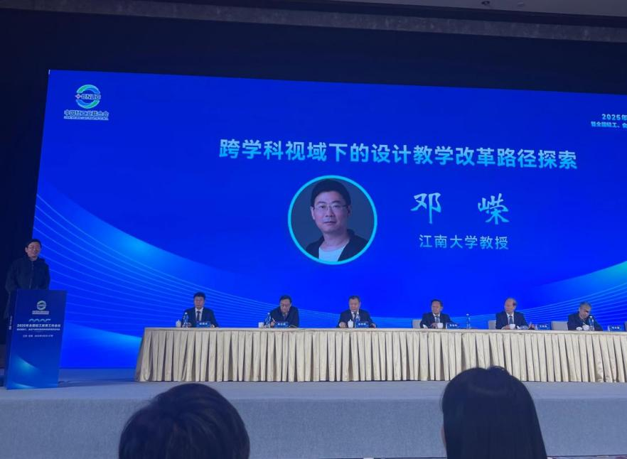 在经验交流环节中,邓嵘教授进行了题为《跨学科视域下的设计教学改革路径探索》的发言。他指出:设计教育的革新必须打破学科壁垒,构建知识融合、产教联动的生态体系。基于十余年的教学实践,团队构建了"课程-教材-实践"三位一体的改革体系:在课程设置方面,以"整合创新实验班"试点为孵化器,逐步形成跨学科课程群;在教学方法上推行"问题导向+校企协同"双轮驱动模式,将企业真实项目引入课堂;在实践环节中注重品牌与商业价值转化,实现人才培养与产业需求的无缝对接。