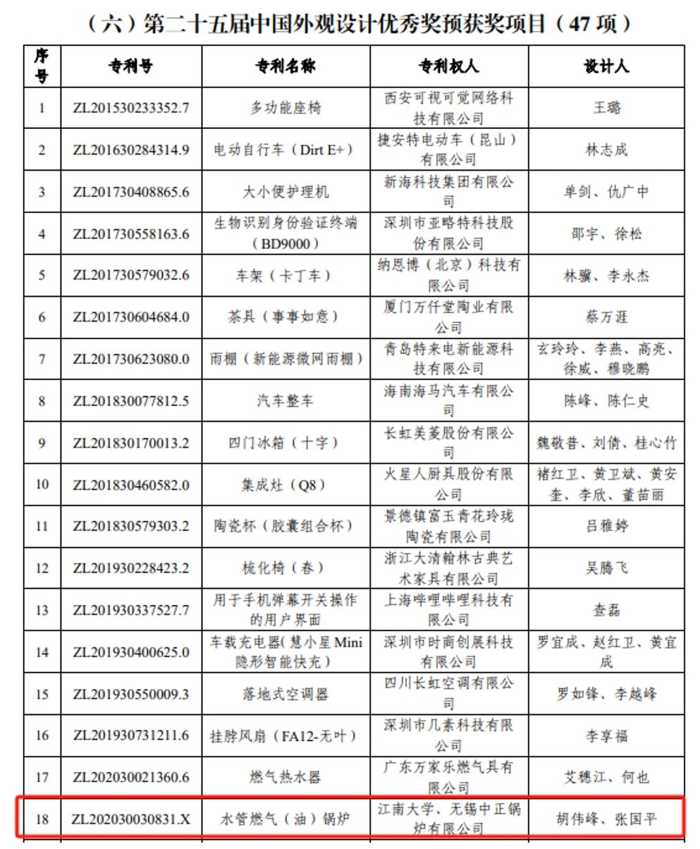 日前,第二十五届中国专利奖评审结果公布,非凡娱乐 胡伟峰教授的“水管燃气(油)锅炉”外观设计专利荣获中国外观设计优秀奖。这是我校外观设计专利首次荣获中国专利奖,实现了新的突破