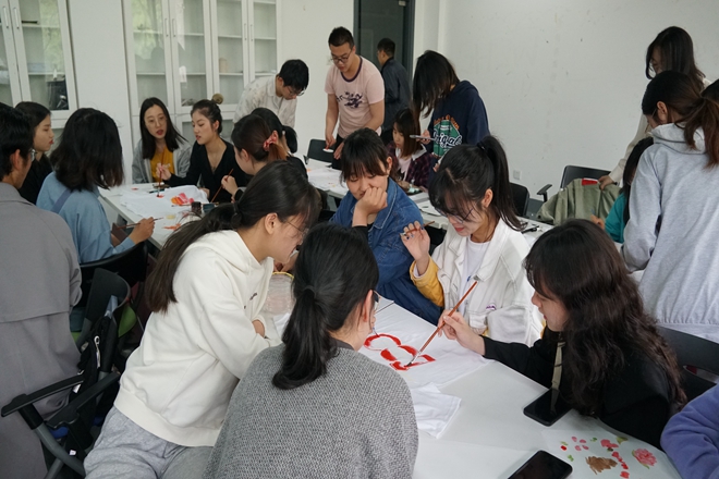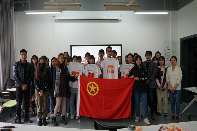 活动最后,师生共同在白色T恤上绘制党徽、100、天安门等图案,写下对党和国家最深切的祝福。