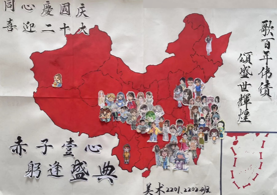 五湖四海缘聚秀美江南,同心向党喜庆祖国华诞。美术2201班和2202班的同学们结合自己的专业特色,发挥自身所长,用画笔勾勒中国地图的一条一线,用中国红填充华夏大地的壮美河山,并将自己的Q版形象贴至自己的家乡省份,以此表达不论来自哪里,都与祖国同频共振;不论身居何处,都祝祖国繁荣昌盛的美好愿景。