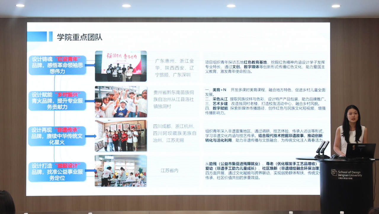 接着,张凌雁介绍了学院四大品牌实践团队,精准对接学校文件要求,以设计之力服务国家战略和区域发展:“红‘设’青年团”:扎根“大思政课”,传承红色基因。“江南青火”乡村振兴团:厚植学术根基,助力乡村振兴。“手指上的中国”调研团:赓续中华文脉,传承优秀文化。“益起设计”志愿服务团:服务基层治理,传递设计温度。