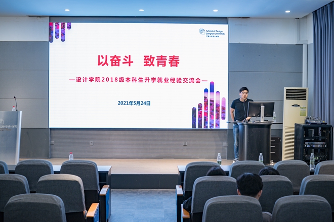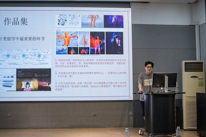 章陈虹同学以自身为例,从选择考研院校出发,提醒准备考研的同学要有“决心、恒心、信心”,要积极备考并持之以恒,重点从复习时间安排谈起,帮助同学们进行合理的复习时间规划。魏汉韬同学则从选择考研专业的角度,讲述了自己准备跨专业考研的历程。他建议跨专业考研的同学们要从了解考研院校、了解考研科目以及了解考研形式三个方面出发准备考研。陈昊烨同学从成功拿到皇家艺术学院offer的经验中,建议同学们应多了解留学信息,再选择和个人背景契合度高的院校和专业。同时,他建议在申请自己感兴趣的方向时尽量选择一些竞争较小的学校,以提高录取机会。此外,他认为同学们应结合自身实际情况选择合适且负责的留学中介,并认真打磨作品集,做到有创新、有细节。陈巧爱同学从毕业去向、设计类企业、简历制作与投递、面试技巧、面试注意事项、入职后的角色转换和人际关系处理等就业经验做了介绍。