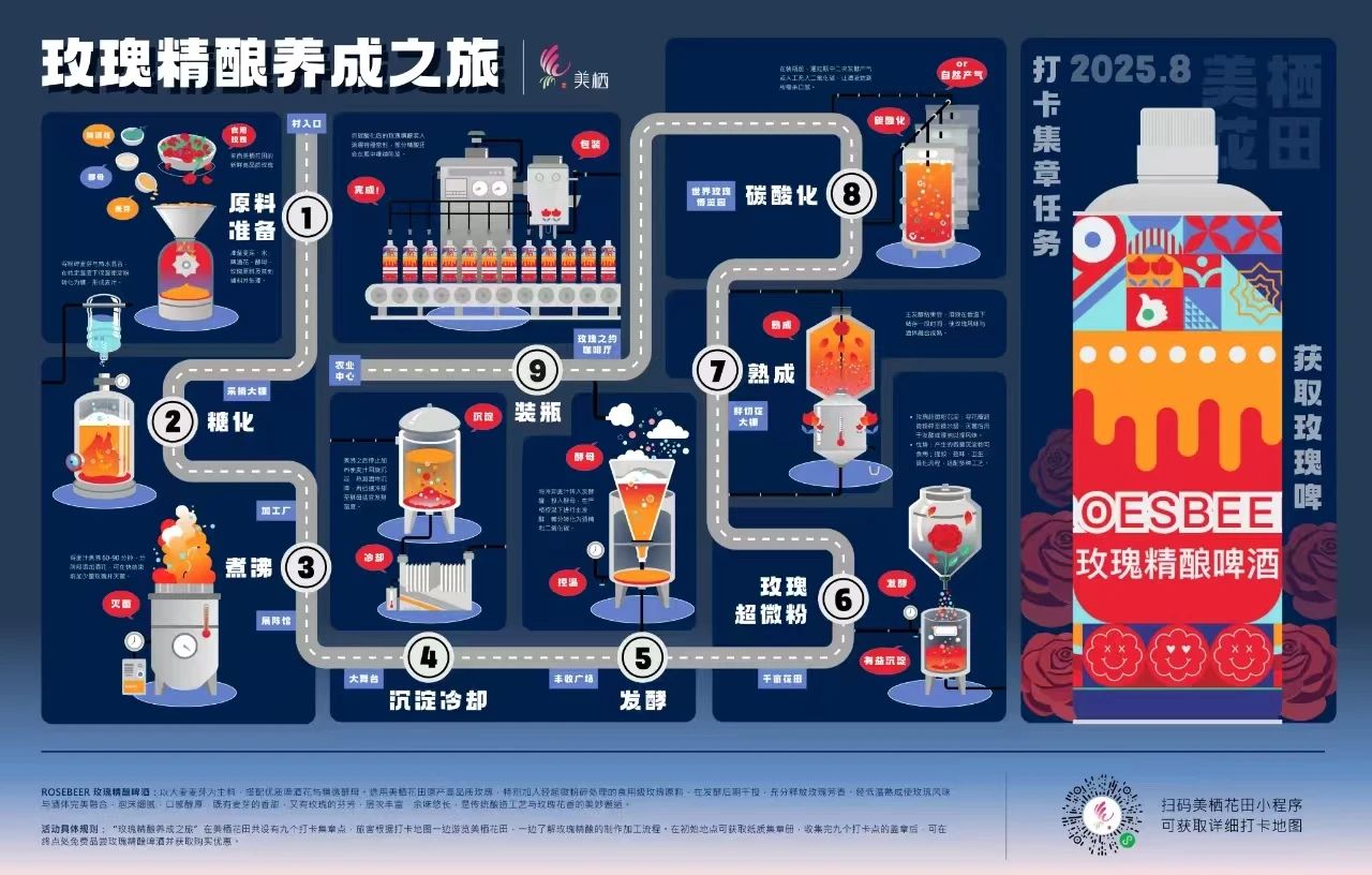 作品《玫酒养成计划——玫瑰超微粉参与的精酿啤酒加工流程信息可视化设计》