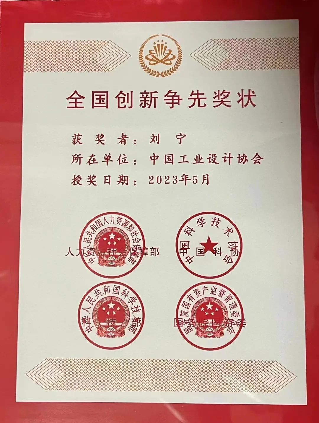 校友刘宁获奖证书