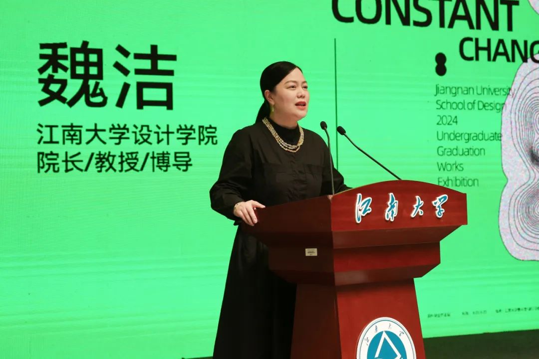 院长魏洁致欢迎辞。致辞中,魏院阐释了本次展览“以应无穷”的主题内涵。“无穷”,蕴含着中国古代哲学中对人与自然和谐共处的深刻理解,而设计正是一种连接人与世界、过去与未来、物质与精神的桥梁。同时,设计边界不断拓展,技术与艺术的融合让设计领域焕发新的活力。这一主题寓意着设计学子们以无尽的创意应对未来的挑战,用设计的语言探索未知,诠释变化,在传统与现代、科技与艺术的交响中寻找平衡。