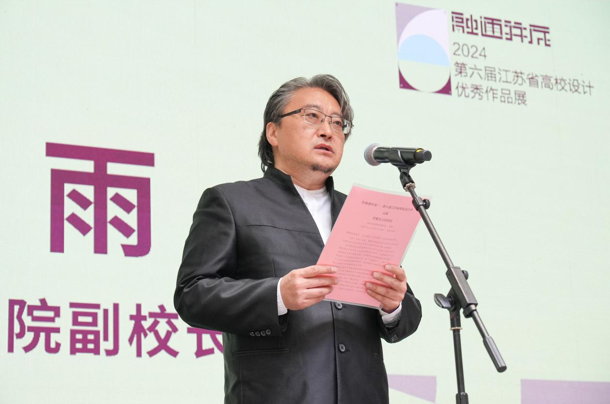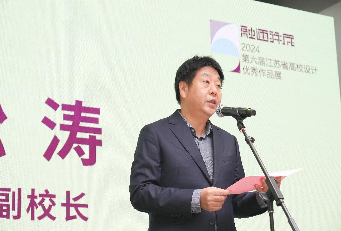 开幕式上,江南大学副校长倪松涛致欢迎辞。倪校长指出,今年恰逢新中国成立75周年,文化艺术在国家繁荣进步中发挥了重要作用。本次展览推动了江苏高校艺术设计教育发展,激发创新活力,为新时代文化建设贡献力量。江南大学将以此为契机,与省内其他兄弟高校共探设计教育的新思路、新方法,培养出更多具备国际视野与创新能力的高素质人才。