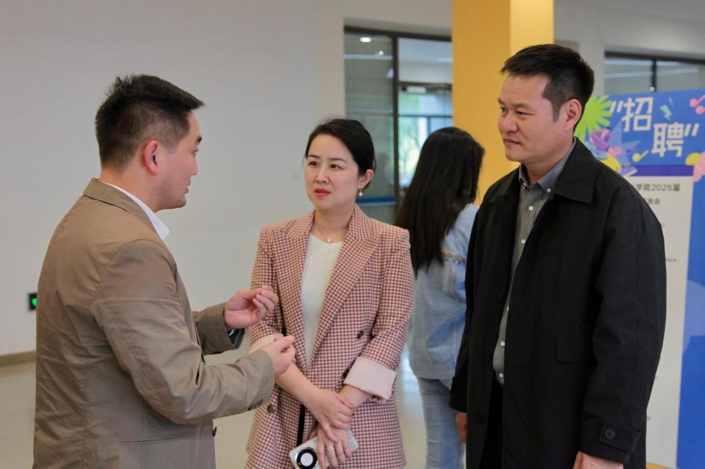 副院长胡伟峰来到招聘会现场,与用人单位进行充分交流,详细了解企业的用人需求,同时还与求职学生亲切交流,给予就业指导、作品及修改意见,鼓励大家树立正确的就业择业观念,抓住应聘的黄金时间段,精准分析自身情况,努力与企业实现“双向奔赴”。