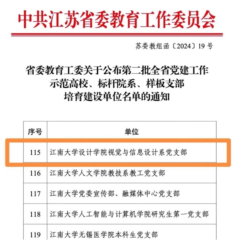党支部介绍:视觉与信息设计系党支部是江苏省第二批全省党建工作样板支部、江南大学示范党支部,现有党员14名,其中正高级职称6位,副高级职称2人,高级职称人数过半;入选国家级人才1人、省部级人才2人;2位党员曾获江苏省优秀共产党员、无锡市优秀共产党员、无锡市优秀教育工作者等荣誉称号;1位党员获聘江南大学至善岗位教授;3位党员获江南大学至善教学奖;3位党员获江南大学“我最喜爱的老师”称号;是一支党性强、奉献精神强的先锋党员队伍,也是一支充满朝气、求真务实、奋发有为、勇于创新的队伍。