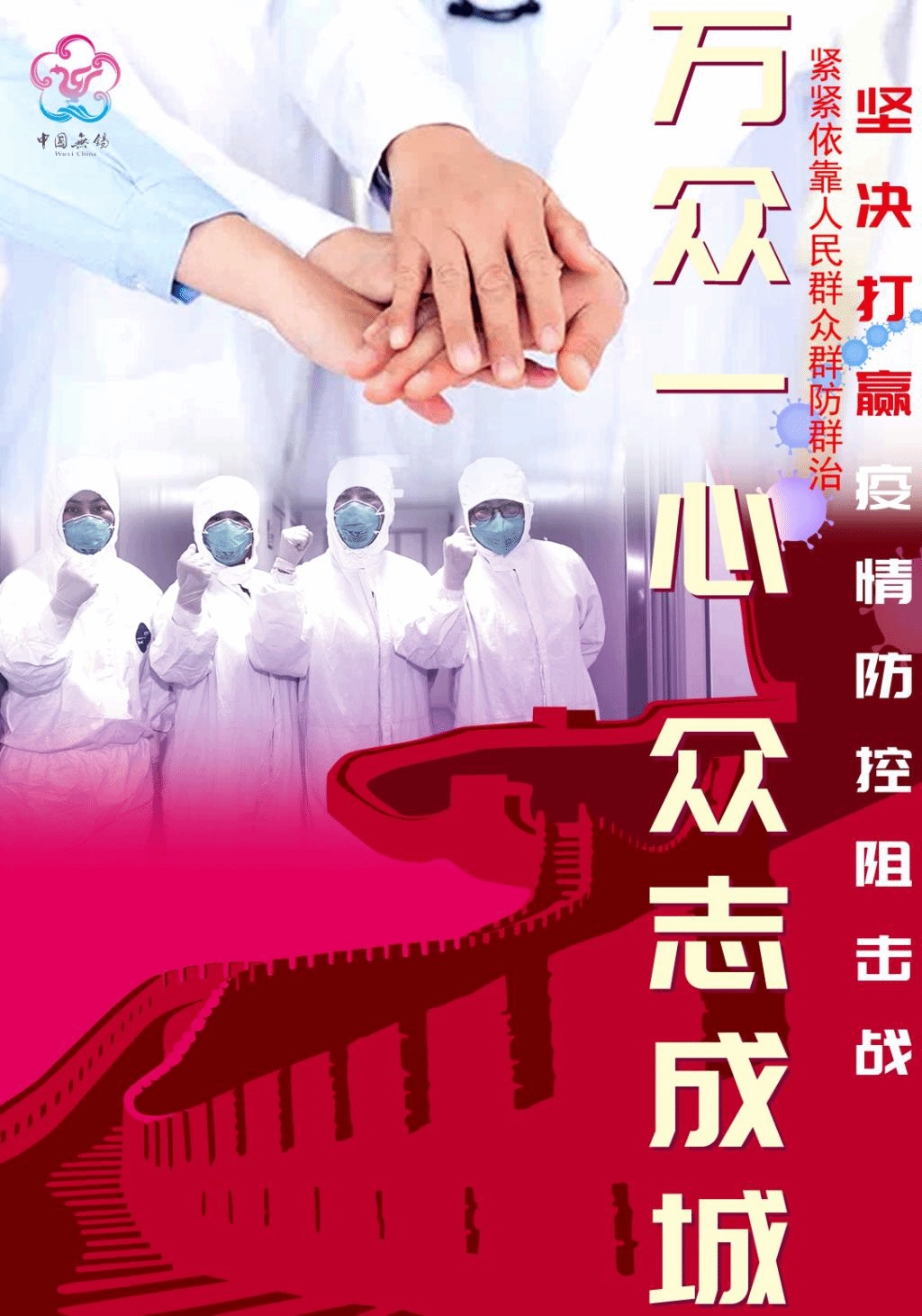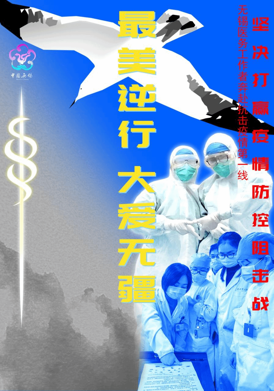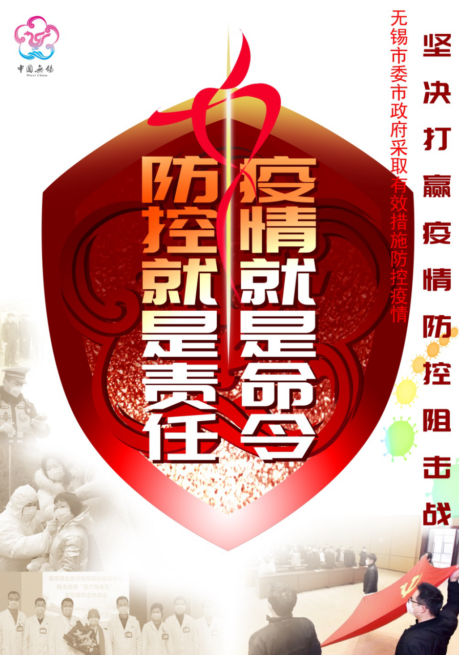 该系列海报作品紧紧围绕当前疫情防控战役主题,从“命令责任”、“最美大爱”、“精准防治”、“众志成城”四个方概括精神理念和展开视觉表现。“命令责任”以防控工作的现场图景为主要素材,充分展现全市各部门在市委市政府领导下各负使命,勇担职责。主体图形是含有无锡城市形象符号图案的盾牌,象征市委市政府的有力领导是全市人民战胜疫情的坚强后盾。“最美大爱”选取医务工作者誓师、驰援等感人场景,以搏击乌云的海鸥作象征陪衬,凸显动与静、阴与晴、柔情与侠骨之间的巨大张力,歌颂我市医疗卫生战士对事业的无比忠贞和对同胞的无私大爱。“精准防治”写实地表现医疗、科研、交运等各级部门运用合理方法与科学手段展开系统防控,宣传科技与良策的战斗力。“众志成城”以巍峨绵延的万里长城作比喻,表现全市人民心连心、肩并肩,在市委市政府的有力领导和统一部署下,以坚强的意志、饱满的信心、高度的责任感和一丝不苟的工作组成抗击疫情的铜墙铁壁。
