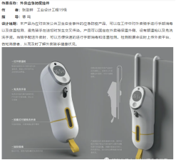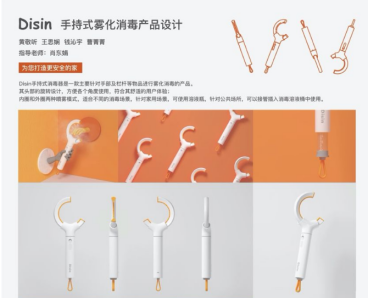 学院研究生导师团队结合专业特点,用设计快题的形式引导研究生秉承发现问题、定义设计机会、探究合理解决方案的“设计人”精神,短短数天内就完成了几十余个抗“疫”快题设计。移动生活方式设计研究实验室的曹鸣老师指导学生张劭耕等设计了《外卖应急防疫挂件》等多个作品,设计的出发点是在移动的生活方式背景下,通过造物,唤起个体防疫意识的觉醒。健康设计研究团队从问题出发,以用户需求为导向,设计了多个抗疫概念作品。邓嵘、时迪老师指导刘胜和同学设计作品《可除雾护目镜》,解决了医护人员佩戴护目镜起雾的问题。肖冬娟老师指导学生黄敬听等设计的《Disin手持式消毒器》 是一款主要针对手部及栏杆等物品进行雾化消毒的产品。