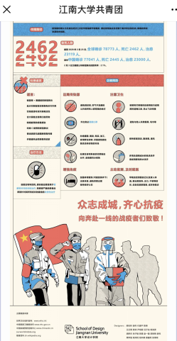 根据学校疫情防控工作部署,加强顶层设计,发挥专业特色,积极迎战疫情,打出了抗击疫情组合拳。学院坚持以艺抗疫,线上、线下联动,组织青年学生加强理论学习,创作战疫精品,志愿服务他人,用行动“硬核”展示设计风采。