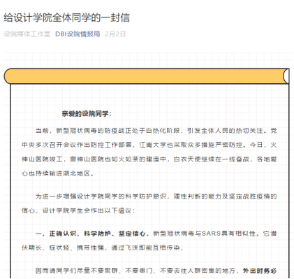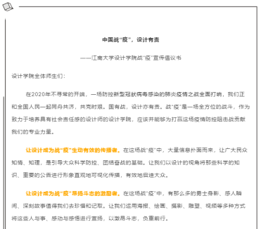 以实际行动践行习近平总书记讲话精神,决心为人民设计,为时代立传。学院发布了战“疫”宣传倡议书,号召全院师生勇于担当,和全国人民一起同舟共济,共克时艰。