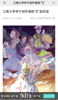 看到倡议书后,设院学子积极响应,踊跃投稿。共收到研究生作品130幅,本科生作品近500幅,学生党员作品137幅,展现了设院学子战胜疫情的坚定信心和作为设计者强烈的社会责任感。视传1603班吴立人的作品《病毒消消消》,灵感来自于消消乐游戏,希望新冠病毒也能被一线的医护人员消消消。设硕1801廖铮同学的作品《对决一线》,让人们意识到了防疫工作的紧迫性、严峻性和重要性,增强了人们战胜病毒的信心。部分优秀的作品被中国青年报、中国青年志愿者官微报道刊登。