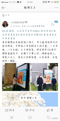 学院青协组织广大同学将前期精心创作的抗疫海报送到社区,帮助基层社区做好疫情防控宣传,和社区工作者肩并肩,以形象明了的视觉语言宣传防疫常识,共同阻击疫情。参加海报张贴的一位同学表示,通过将自己创作的作品从屏幕转入到布告栏前,向社区居民宣传抗疫知识,自己受益匪浅,觉得能够力所能及地为抗疫做点什么是件很幸福的事。同学们还在微博上开启了话题,将自己的活动照片发布到微博上,让更多的陌生人了解、参与、分享此活动,也号召更多的人参与其中,希望让更多的城市点亮战疫之“星”。