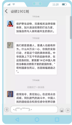 学院精心组织全体师生齐聚“云端”,通过线上集体学习、个人自学等方式收看疫情防控思政大课直播,并组织学生开展课后讨论,发表感想。同学们讨论踊跃,工设1902团支部书记韩志鹏表示“自豪,这是我在看完整个讲座后脑海中第一个浮现的词语。虽然我未曾身入前线,与千百万医护人员同生死,共命运,但这两个月中政府,以及社会群众所做出的点点滴滴是潜移默化的,这无不提醒着我,我们中国人是拧成一股绳的,我们有能力战胜并在疫情中获得未来进步的机遇。”