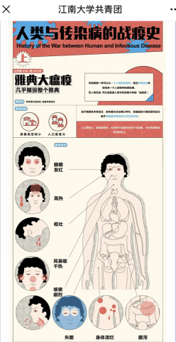 历来注重培养学生的社会责任感,希望他们能够将理论和实际相结合,学以致用,回馈社会。吴祐昕教授团队联合校团委,指导学生利用信息可视化的手段将《人类战疫史》这本书总结为十五张图片,更好的助力疫情防控宣传。这十五幅作品以时间为主线,简要概述了人类在面对重大世界性传染病时所采取的措施和逐步取得的成就。图片采取信息可视化的手段,直观明晰地展示了人类与十五大传染病的战斗历程。