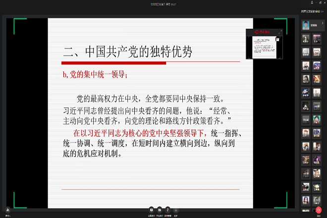 讲座中,张瑶瑶老师以疫情为切入点,将中国全力严防严控之下扭转乾坤的疫情和西方个别国家愈来愈严重的疫情形势两相对比,凸显我国体制优势给防控疫情带来的重要影响。中国人民团结一致坚决打赢抗疫战,从疫情萌生时的迅速应对到防控救治两不误,再到国内一个个省市的“清零”,这一切都离不开中国共产党与生俱来的独特优势。