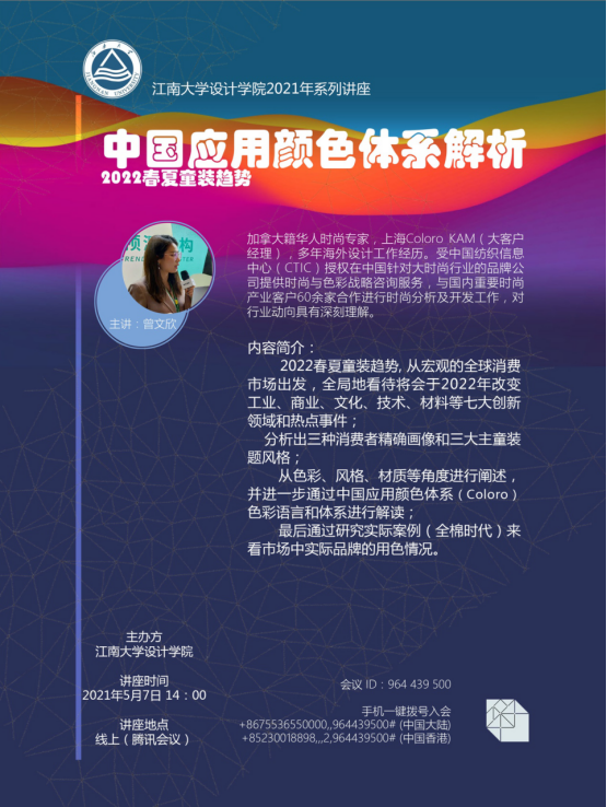 服装与服饰设计专业的师生通过腾讯会议平台聆听了加拿大籍时尚专家曾文欣女士题为《中国应用颜色体系解析——2022春夏童装趋势》的专题讲座。
