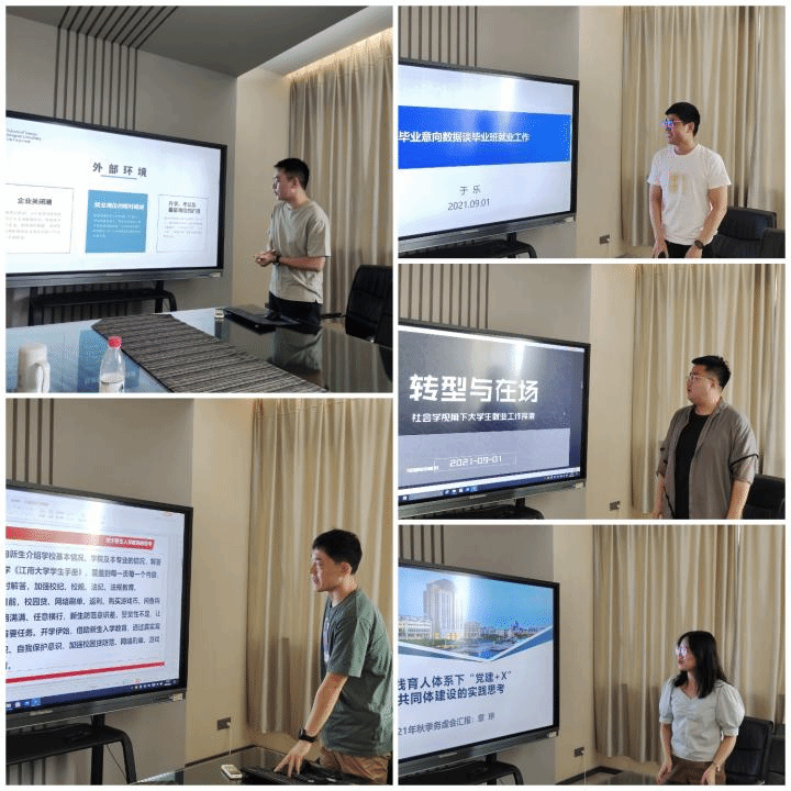王涛从后疫情特征的时代背景中对新学期就业工作作出思考。他认为伴随着疫情对社会的持续影响,就业工作主体、内容、形式都将随之改变,他提出要发挥流媒体的优势,充分挖掘短视频对就业指导工作的价值。冯永鹏围绕新生成长提出七个教育的理念。他认为,新生入学教育是全过程育人的重要一环,事关育人成效,精准的“入学教育”,这有助于增强新生的纪律观念、法纪观念、集体观念,激发他们的求知热情,有助于帮助他们树立争取的学业观、职业观。于乐围绕新学期就业工作,根据毕业意向统计数据系统分析了毕业生升学、就业面临的挑战与机遇,从“推手”“舵手”“触手”“抓手”等方面探讨了如何加强大学生就业指导工作,促进大学生充分就业。林寅以“转型和在场”为题,以社会学视角,依托社会结构理论,从就业政策的沿革、学生观念的转型、区域差异对学生整体气质的影响和具体工作的开展,对开展和促进大学生就业工作谈了自己的计划和体会。章琳对“党建+X”党建共同体建设进行研究,她提出,基于实践育人体系,通过构建“党建+X”党建共同体,将党建工作、思想政治引领工作和实践育人工作融会贯通,在丰富的实践活动中持续激发培养青年大学生骨干的品德修养,辐射引领和带动广大青年大学生更好地服务于社会,从而进一步加强学生党支部的生命力、战斗力及凝聚力。