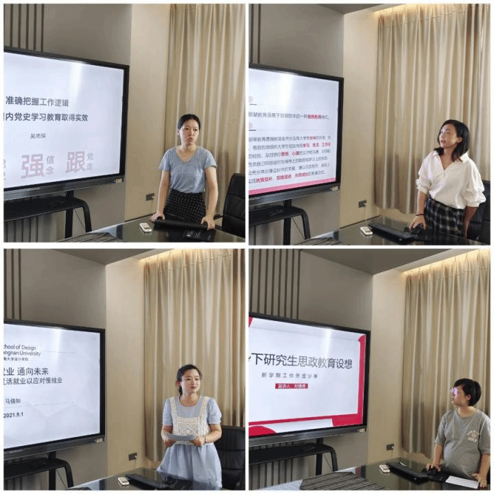 吴雨琛以“准确把握工作逻辑,推动团内党史学习教育取得实效”为题,探讨学院共青团工作开展的方法。她认为,学党史要与育人有机结合,要依托团的组织体系优势和动员能力,以组织化学习为基本方式,以团支部为基本单元,严格落实“三会两制一课”制度,推动学习教育接地气、聚人气。曹淑慧挖掘朋辈教育的意义,重点阐述了朋辈教育在大学生思想政治教育合力系统中的重要性。她指出,朋辈教育应涵盖多层次的价值导向,通过构建学院、班级、校友朋辈榜样教育助力大学生在不同学习阶段的成长。郑倩倩聚焦新形势下研究生思政教育,她认为,辅导员在日常管理服务中挖掘思想政治教育元素,实现管理和思政教育两者融合式发展,将有助于提高研究生思政教育的成效。她分析了目前研究生思政教育的难点,并从入学教育、干部选拔、奖助评定、心理健康四个方面提出新形势下研究生思政教育的设想。马倩如聚焦当前设计学生“慢就业”的现象,分析了当下毕业生慢就业的原因,梳理了灵活就业的优势与劣势、从事灵活就业的必要条件并结合数据和案例讲解,提出了新形势背景下就业工作的新观点,新思路。