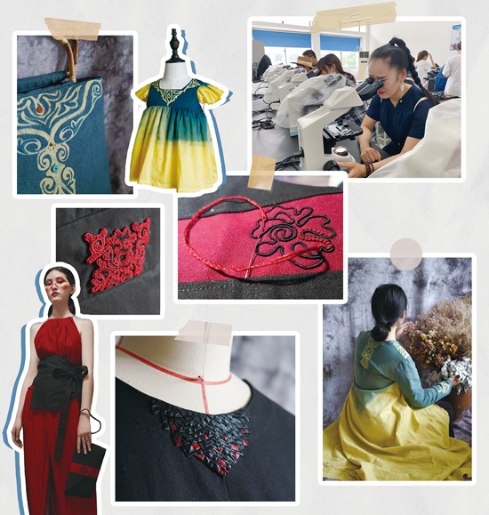 但同时,李仕娅改变了“苗疆魅影”的传统配色,大胆尝试了本季时尚的对比色调——红黑撞色;提炼了刺绣图案,简约而突出主体;并探索刺绣和更多材料结合的可能性。在之后“亲子系列”的设计上,她就用蜡染、植物彩色套染的方法,让密蒙花的黄和靛染的蓝碰撞融合。