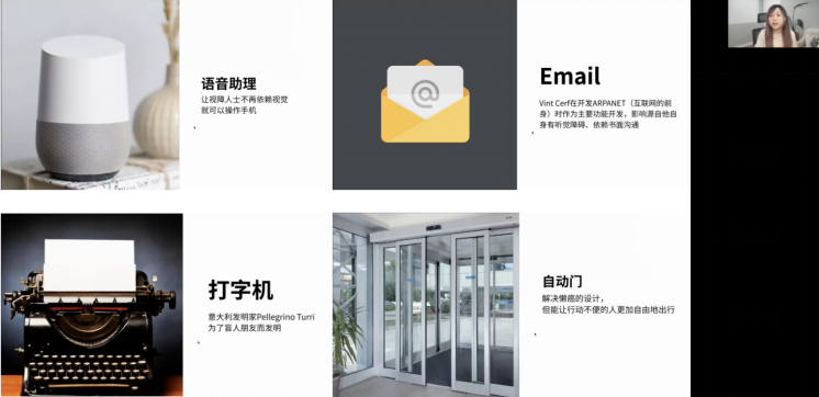 来自谷歌的夏冰莹女士发表了题为“无障碍与包容性设计:不止为少数人,也为所有人”的演讲。她的演讲通过丰富的案例层层深入,倡导通过设计和技术弥合大众和残障人士在能力上的差异,打破为大众的设计和无障碍设计之间的鸿沟,创造更平等和人人受益的理想世界。