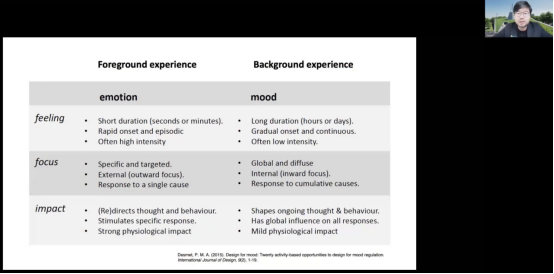 来自代尔夫特理工大学的薛海安博士以“聚焦用户心情的体验设计”为主题,,阐述了情绪(emotion)和心情(mood)两种心理状态对体验的不同影响,并聚焦于关注心情的用户体验,深入呈现了心情的种类、描述方式,以及在设计流程中的应用工具,为设计师理解心情和体验提供了更精准的维度。