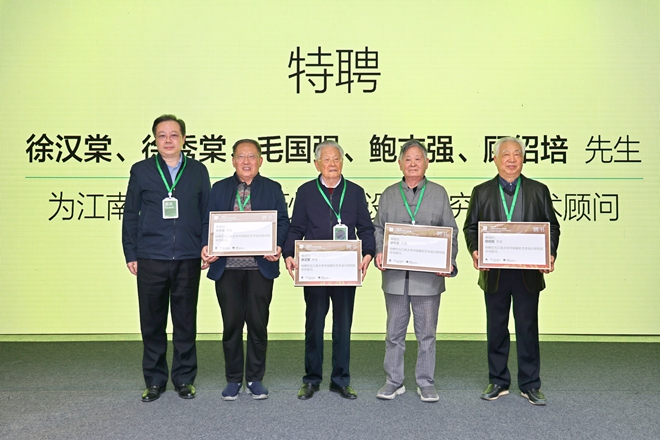 随后,朱庆葆、堵国成、沈晓红、徐汉棠共同上台为江南大学中国紫砂艺术设计研究院揭牌,江南大学中国紫砂艺术设计研究院院长王峰教授上台受牌。活动现场举行了研究院名誉院长和学术顾问聘任仪式,朱庆葆分别为到场的徐汉棠、徐秀棠、毛国强、顾绍培等四位国家级工艺大师颁发了研究院学术顾问聘书。