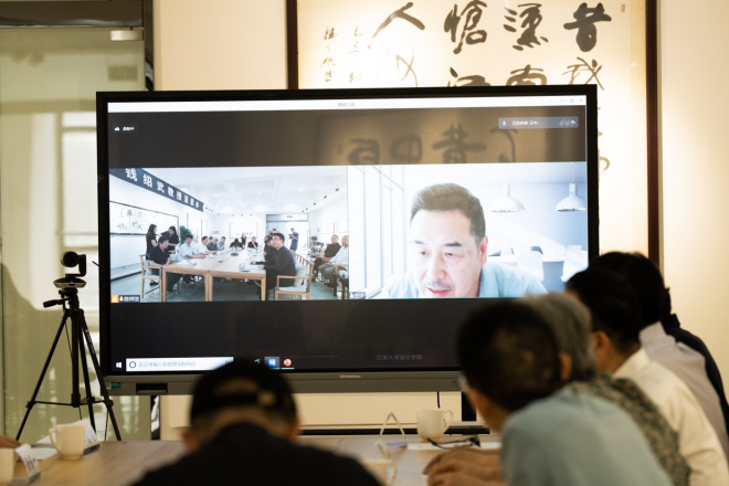 在钱绍武艺术馆书法厅,全体与会人员追思座谈。伴随着一张张幻灯片,与会人员共同追忆了钱绍武教授的生平,特别是他在无锡期间与江南大学的不解渊源,和他对江南大学设计艺术教育做出的卓越贡献。