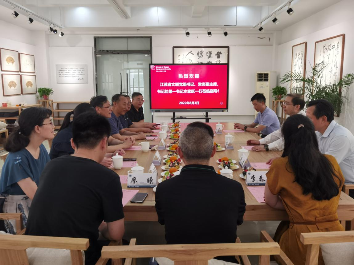 8月3日下午,江苏省文联党组书记、常务副主席、书记处第一书记水家跃一行到江南大学考察指导,无锡市文联党组书记、主席杨建、无锡市民间文艺家协会驻会副秘书长阚波陪同考察;校党委常委、副校长吴正国、校党委常委、党委办公室主任朱飞、非凡娱乐