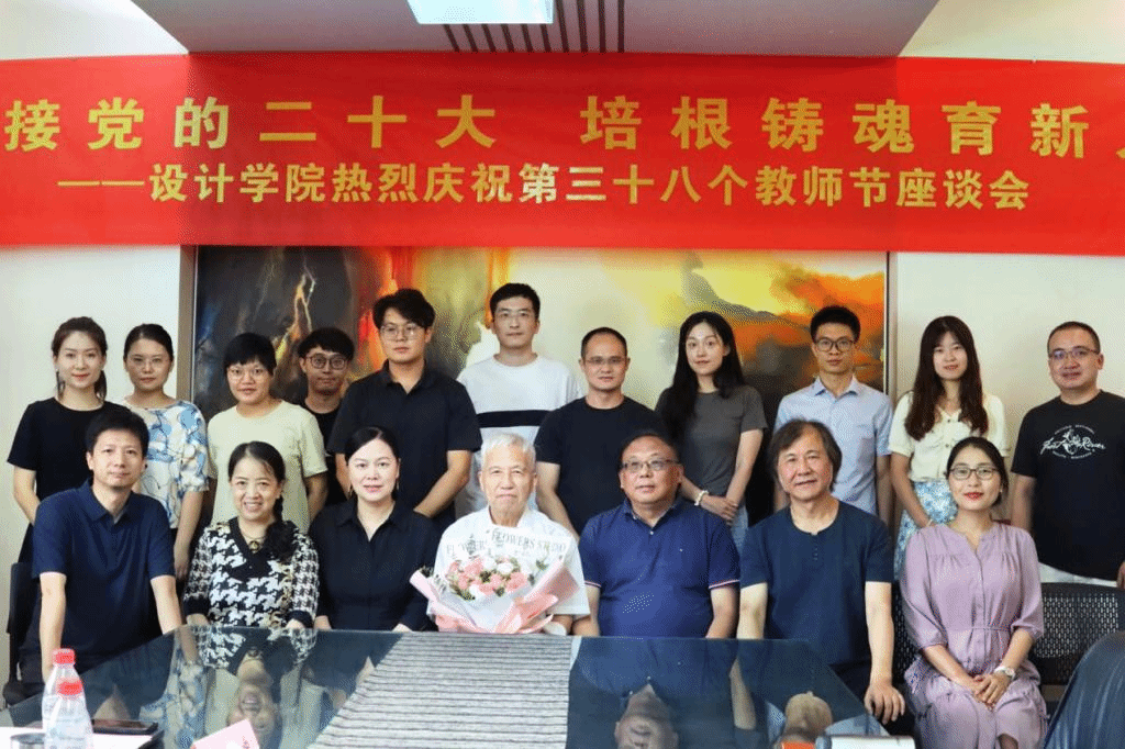 热烈庆祝第三十八个教师节座谈会在学院B304会议室举行。院党委书记邱建平、院长魏洁、首任院长张福昌教授、环境设计系杨茂川教授、视觉传达与信息设计系王安霞教授、工业设计系主任梁峭副教授,以及非凡娱乐