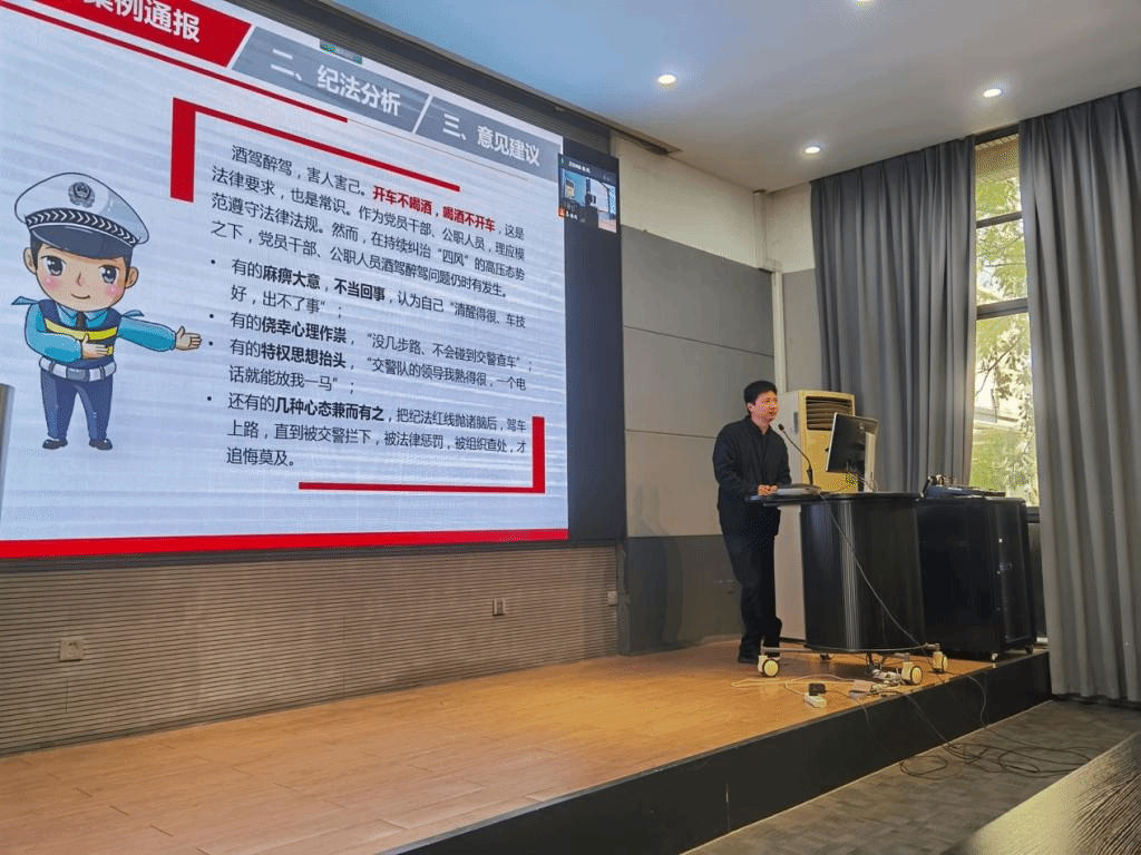 随后,结合学校《关于开展酒驾醉驾问题专项整治工作的通知》学院纪检委员曹鸣副院长以《时刻绷紧纪律弦莫让酒驾毁前程》为题,通报了中央纪委国家监委、无锡市纪委监委、纪检机关通报的部分高校酒驾醉驾案例;向大家强调了酒驾、醉驾的影响和酒后驾车产生的严重后果,号召全体教职工以案为鉴、汲取教训。