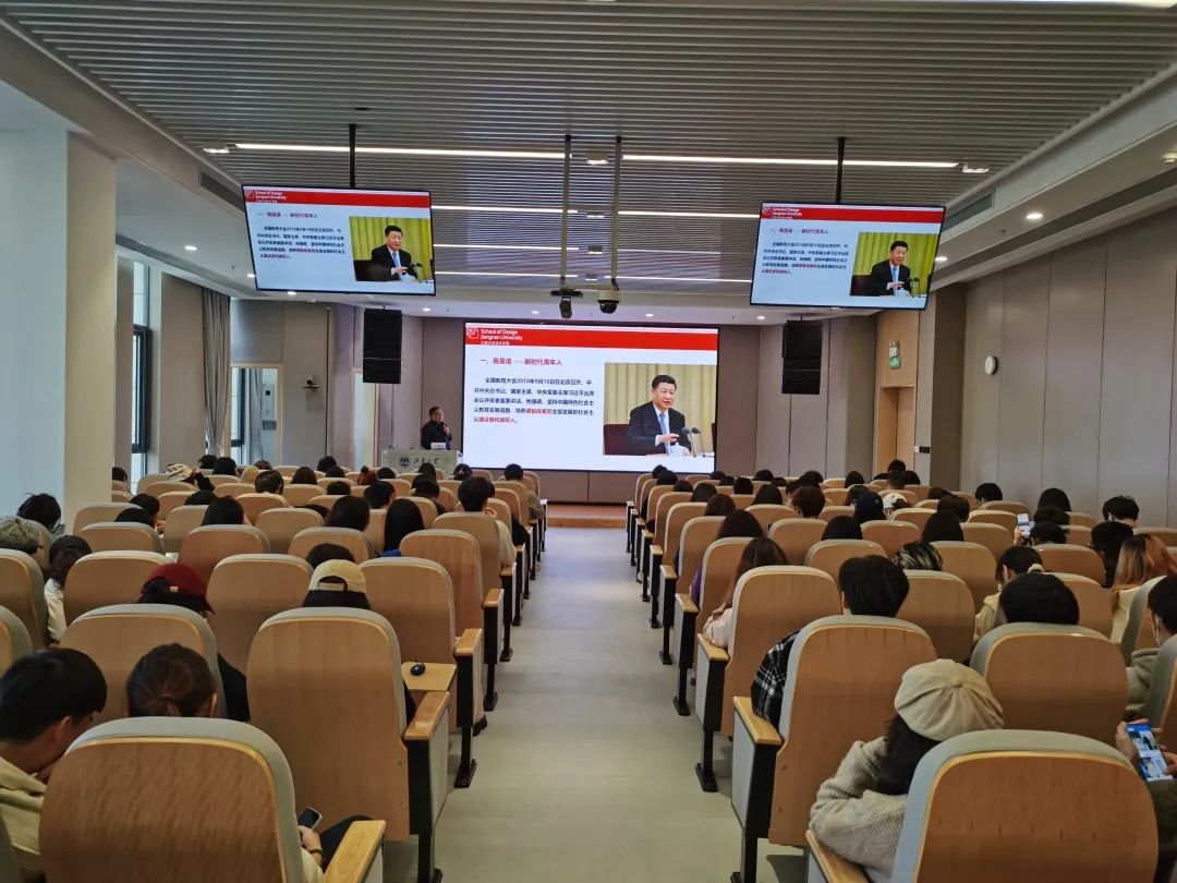 本堂思政课主要包括“我是谁、我骄傲、我设计”三部分内容,邱书记以习近平总书记在全国教育大会上发表的重要讲话引入,分别从“新时代青年人”、“为新时代设计”、“设计强国有我”三个方面开展思政教育,并带领大家学习了习近平总书记对于青年一代的殷切嘱托,希望2022级新生坚定提升认识高度,不负时代、不负韶华、不负党和人民的殷切期望,努力成为德智体美劳全面发展的社会主义建设者和接班人。
