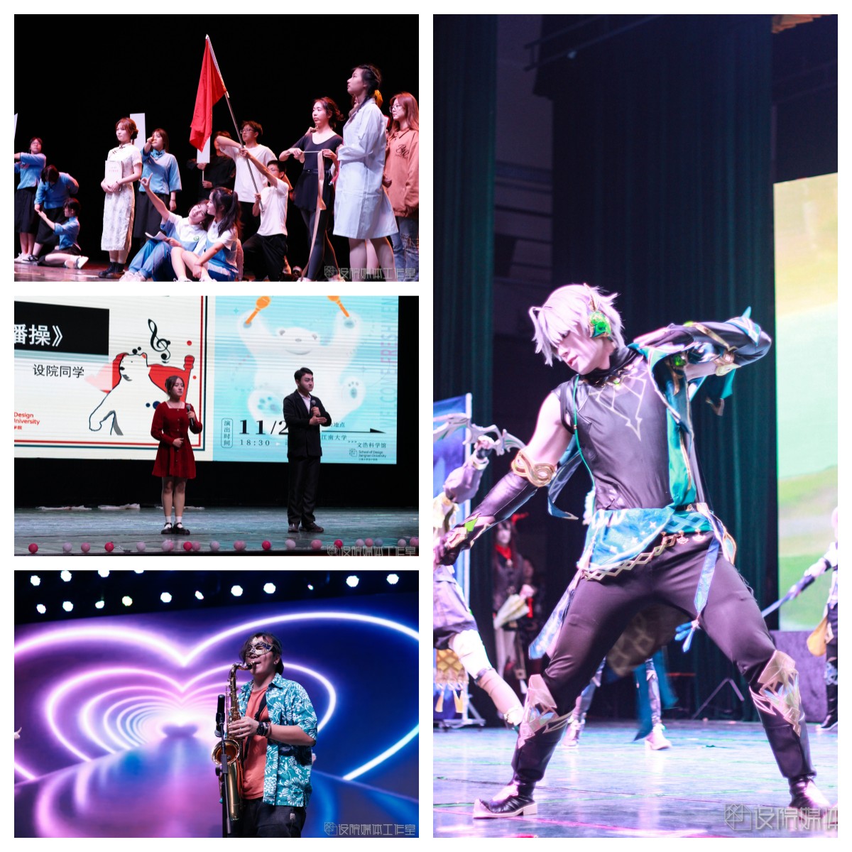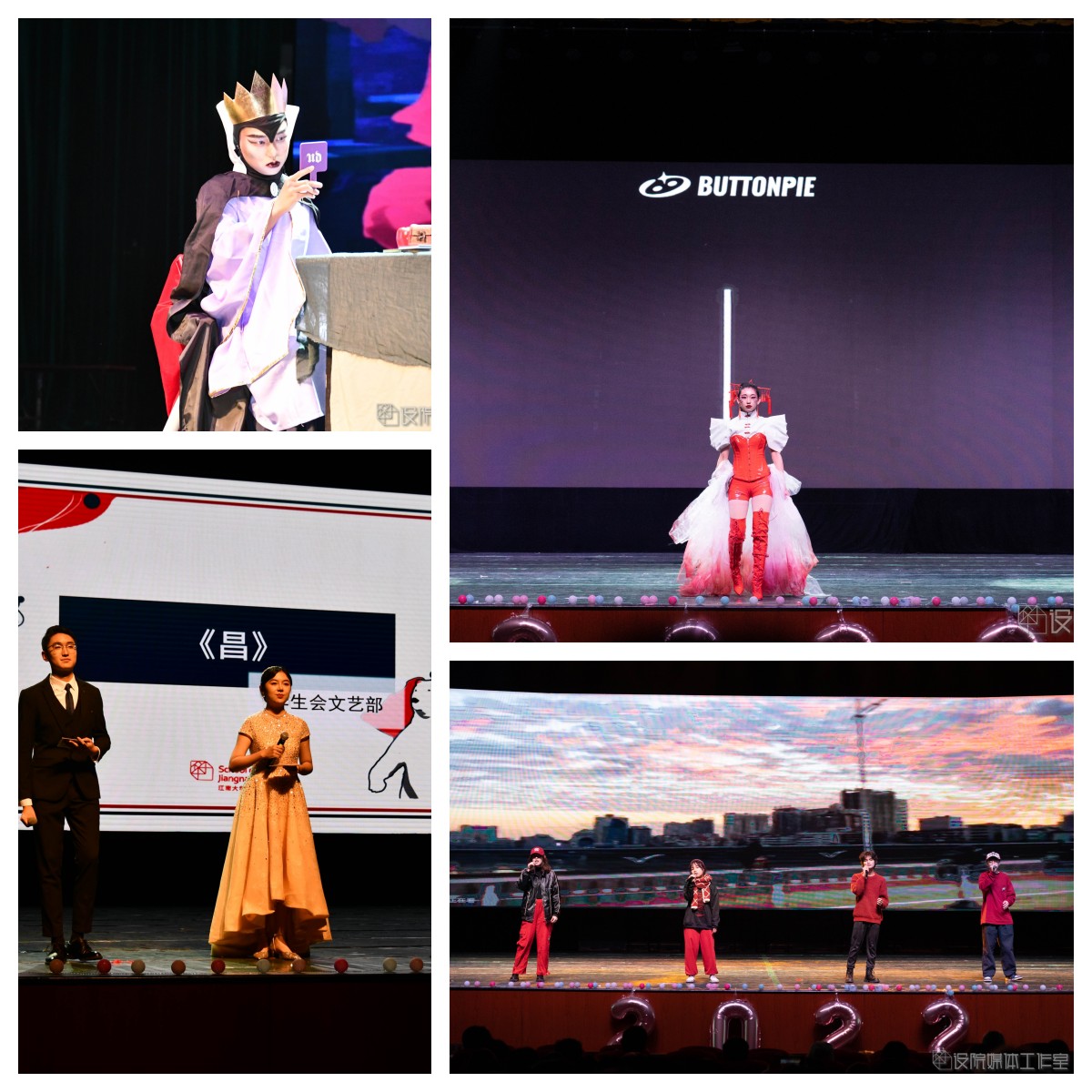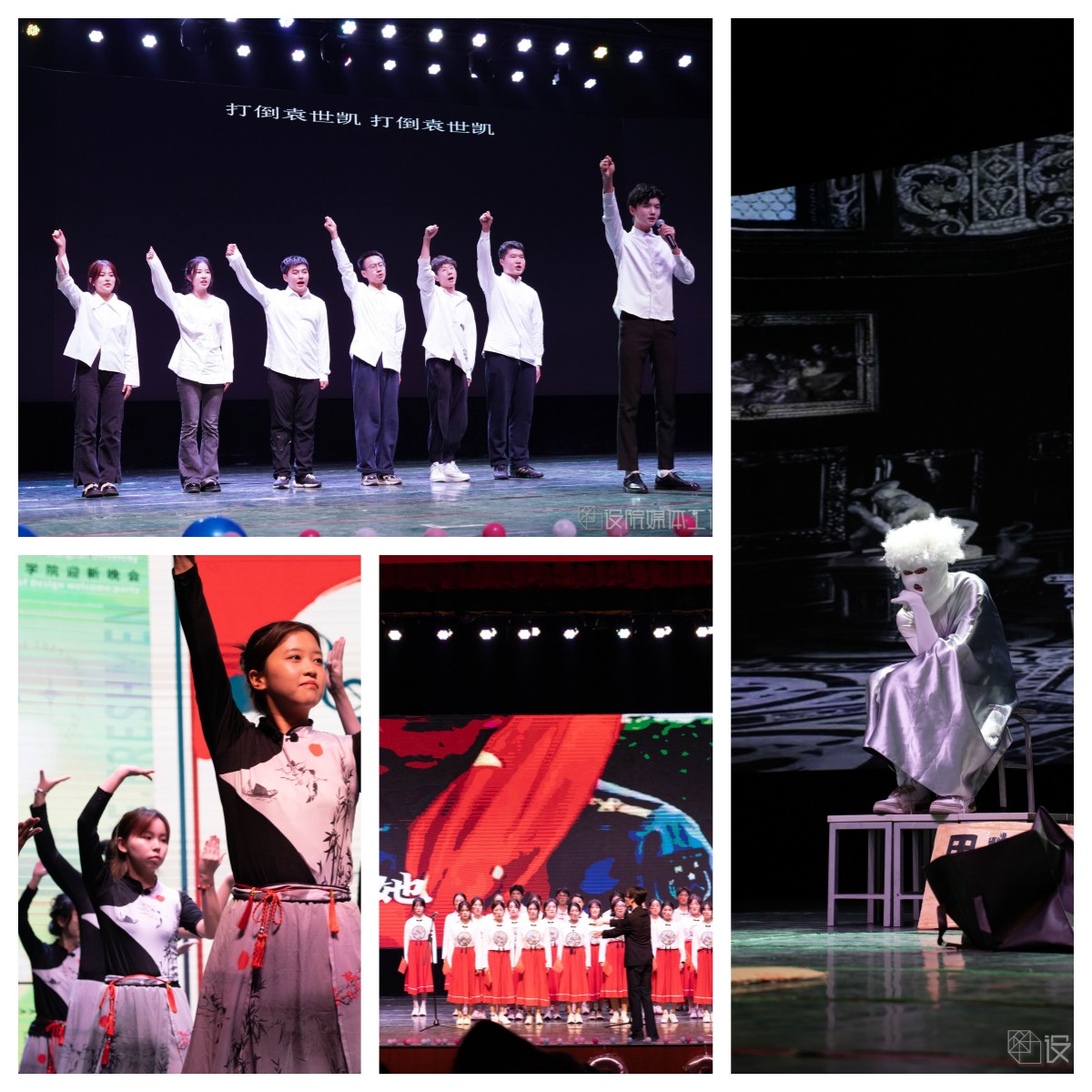朗诵《少年中国说》让我们满腔热血,情景剧《博物馆奇妙夜》别出心裁,歌舞《童年回忆》带我们梦回童年,《名画再现》上演《八女投江》的动人故事,幕布话剧《光映时代》起承中国百年路,转合民族奋斗史,《设院学生日常生活图鉴》上演“设院探戈”,舞台剧《达拉崩吧设院分吧》被全新演绎,《CHINA-X》服装系学生为我们带来一次精彩的走秀,文艺部带来娓娓动听的歌曲《昌》和令人惊艳的舞蹈《山河画卷》,在最激动人心的中场抽奖环节,一个个彩球抛起,随着“锦鲤们”的陆续揭晓,现场气氛在掌声与欢呼声中变得越来越热烈。新的艺术表演形式wota艺《万神花火》让我们眼前一亮,舞台剧《迪士尼后妈茶话会》演绎反派的魔幻童话故事,舞蹈《Helicopter》彰显青春风采,话剧《我们说好不内卷》带来一场反内卷小分队的“战斗”,勿氧器乐团带来的歌曲《海芋恋》温柔浪漫,话剧《反诈银行》上演爱国老人和正义银行的爆笑故事,设院同学们的合唱《有我》在歌声里彰显青春力量,A108cos社带来的《虚空劫火》更是燃爆全场,最后,非凡娱乐
