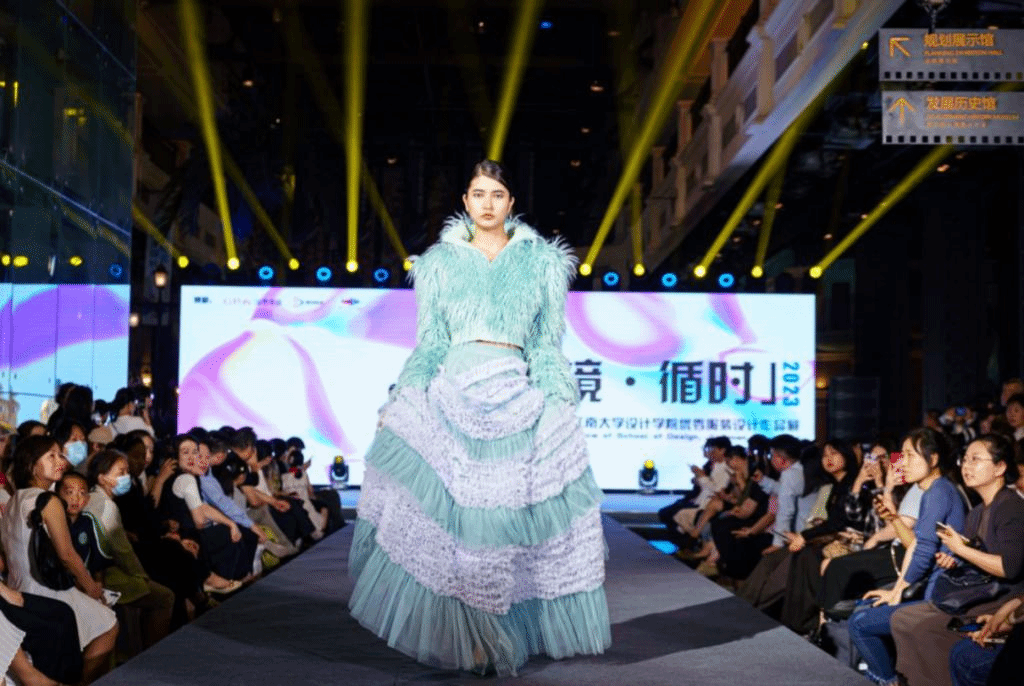 随后,举行了2023届服装专业优秀设计作品发布会。本次作品汇演主题是“融境-循时”:融境,融自然之境,寻和谐之道;循时,循时尚之趋势,承未来科技之发展。服装系的新锐设计师们,突破限制、融合多元美感,谱写服装的诗与远方,通过对传统和多元文化的融合重塑,以新兴的姿态,展现华夏民族独特的艺术风情。 设计师们感悟传统艺术的内核,发扬东方风采,创建了新时代的服饰风格,近130件优秀毕业设计作品参加了本次展演。