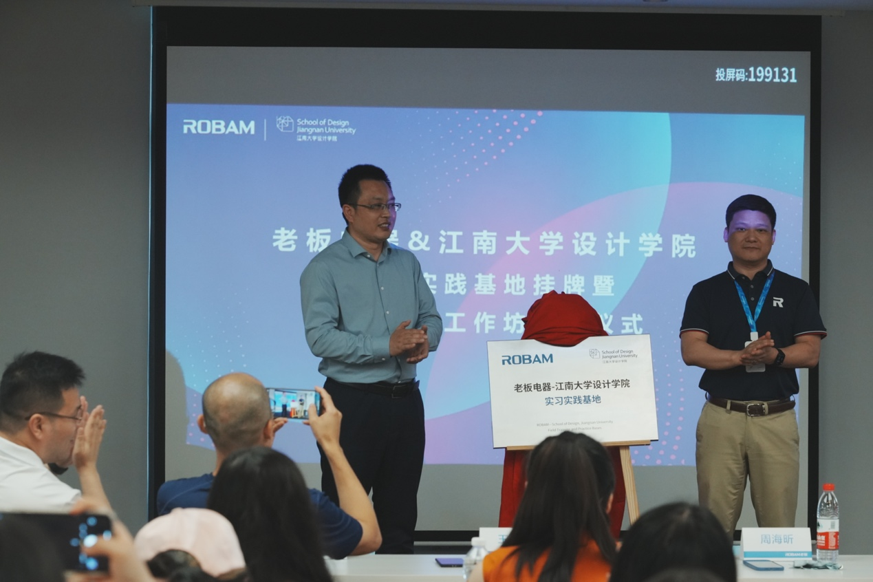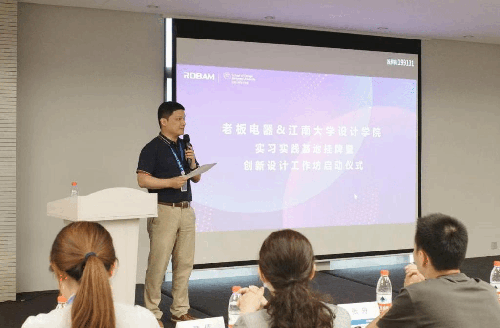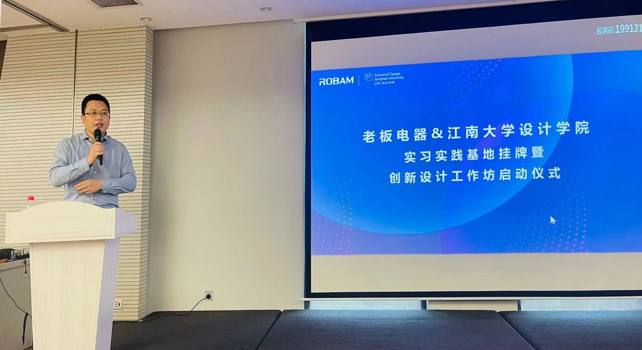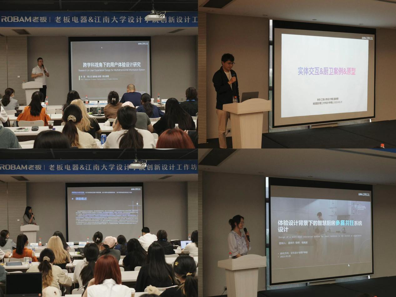 当天下午,工作坊课题发布如期进行。老板电器创新研究院张银峰院长首先介绍了老板电器企业及设计相关的情况。随后由江南大学李瑞、李存两位老师做了关于用户体验设计方法和智能交互设计方法、设计前沿等相关内容的分享。以及三位联合培养的研究生分别就场景化定制厨电系统设计、多餐共饪交互设计、智能厨电多模态交互设计等方面做了课题和成果的介绍。