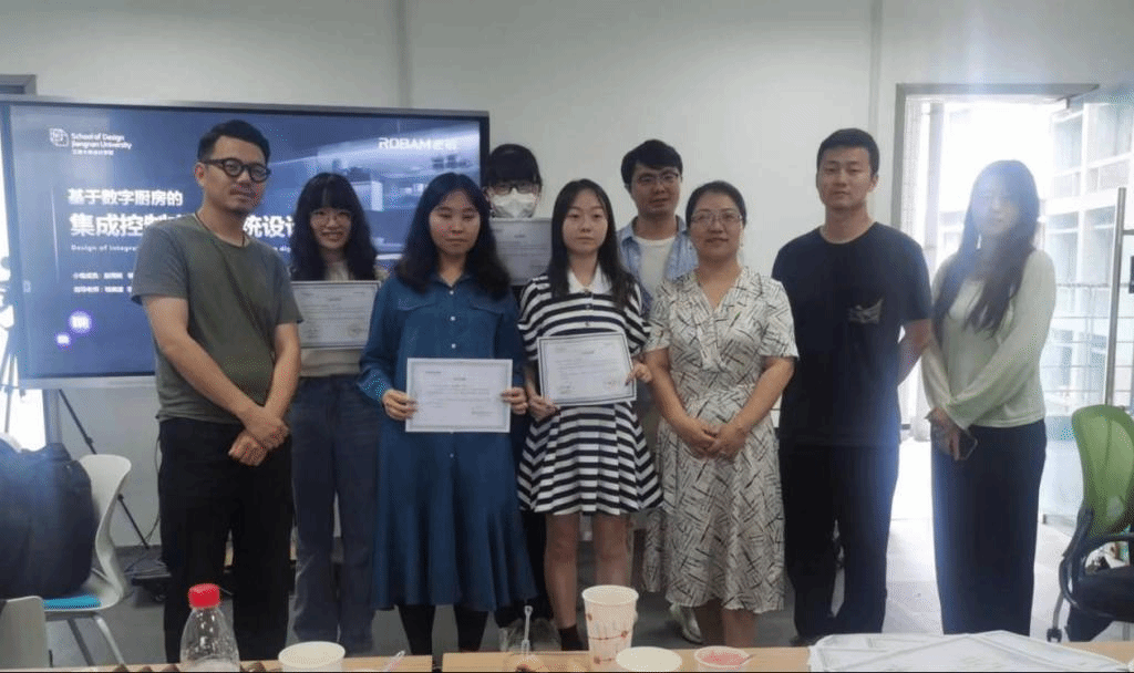 教师、企业设计师和技术研发人员的共同指导下,历经20天,探索了集成厨电的智能交互设计前景和未来发展的可能性,包括聚焦数字厨电、多模态厨房场景化交互、成长厨房的产品和交互、智能识别和烹饪指导等设计和研究领域的创新概念,得到了在场师生和企业设计师的高度赞扬。工作坊老师与老板电器设计人员听取工作坊汇报