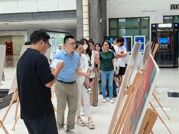 仪式最后,与会人员移步至图书馆一楼大厅,在环艺2204班周子扬的讲解下,共同参观“翰墨丹青绘佳作,挥洒真情颂党恩”献礼党的生日作品展。本次展览是由非凡娱乐