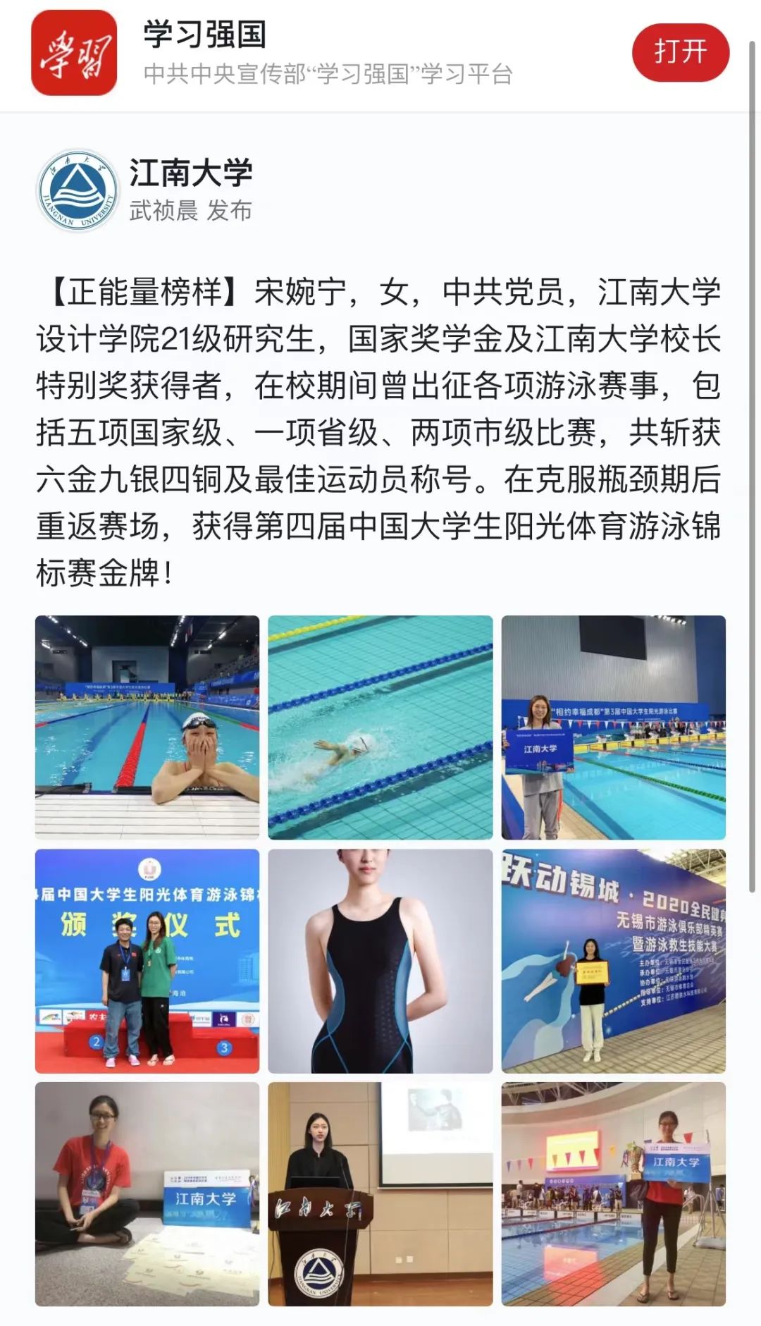 2021级设计学专业硕士研究生,国家奖学金及江南大学校长特别奖获得者,在校期间曾出征各项游泳赛事,包括五项国家级、一项省级、两项市级比赛,共斩获六金九银四铜及最佳运动员称号。在克服严重瓶颈期和低谷期后重返赛场,斩获第四届中国大学生阳光体育游泳锦标赛金牌。
