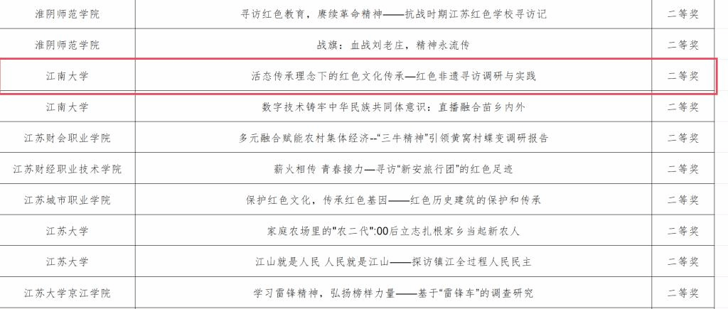 近日,第十八届“挑战杯”全国大学生课外学术科技作品竞赛”红色专项“活动江苏省选拔赛拟授奖名单公示,我院推报的作品《活态传承理念下的红色文化传承—红色非遗寻访调研与实践》荣获二等奖,实现该类别赛事奖项历史性突破。