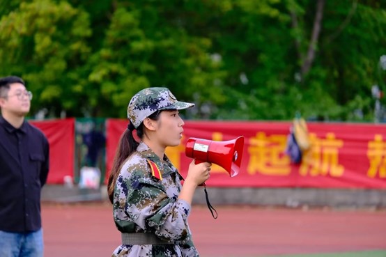 活动中,在教官引领下,一排作为代表进行队列展示,他们身姿笔挺、整齐划一,昂首阔步,尽展青春“戎”光。六排的军训标兵、环艺2202班的吴云天同学作为代表发言,她代表全体军训学生感谢教官的教导、辅导员的陪伴和老师们的问候,并以自己每天的变化为例展现着自己身体素质的进步和自律能力的增强,最后她代表同学们向老师、教官们庄严承诺:服从命令听指挥,团结互助创佳绩。