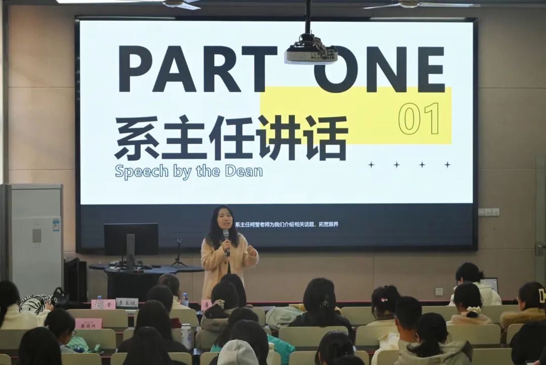 系主任柯莹老师向同学们详细介绍了我院服装专业的特点和专业构成。她指出,艺术与科技联系紧密是服装系的一大特点。服装的有形式设计体现了艺术之美,这属于服装与服饰设计专业的学习方向。服装的功能性体现了科技之力,这属于服装设计与工程专业的研究内容。服装系的两个专业都含有交叉学科的性质,柯莹老师希望同学们基于自己的兴趣,助力服装艺术与科技双向融合发展。