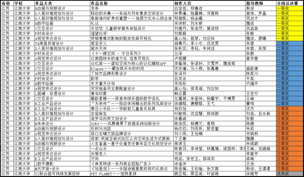 34件作品脱颖而出,成功斩获一等奖7项,二等奖13项,三等奖13项,优秀奖1项。江南大学荣获卓越贡献奖暨全国总决赛一等奖单位。
