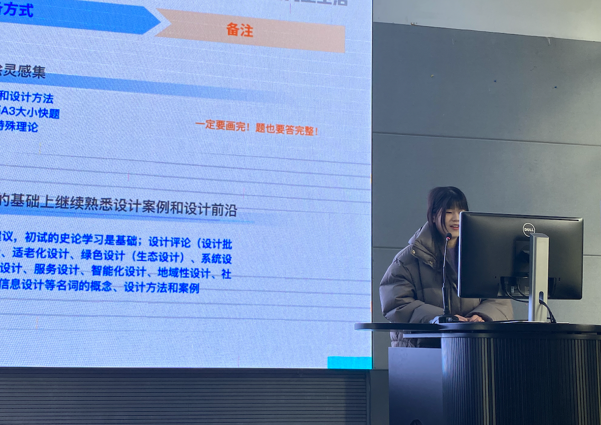 首先,朱永琛同学介绍了2023年考研初试的准备内容和复习方法;接着她着重分享了考研复试的复习重点以及建议,指出复试笔试要注重初试理论知识的完善和提升,并且要坚持练习手绘,保持手感;最后还特别强调了作品集要扬长避短的重要性;